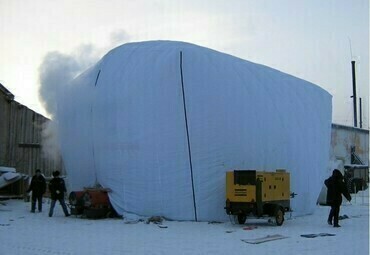 Размер 6000*14000*6000 (быстровозводимые бескаркасные лёгкие палатки) для ремонта спецтехники используют в холодное/ дождливое время года.